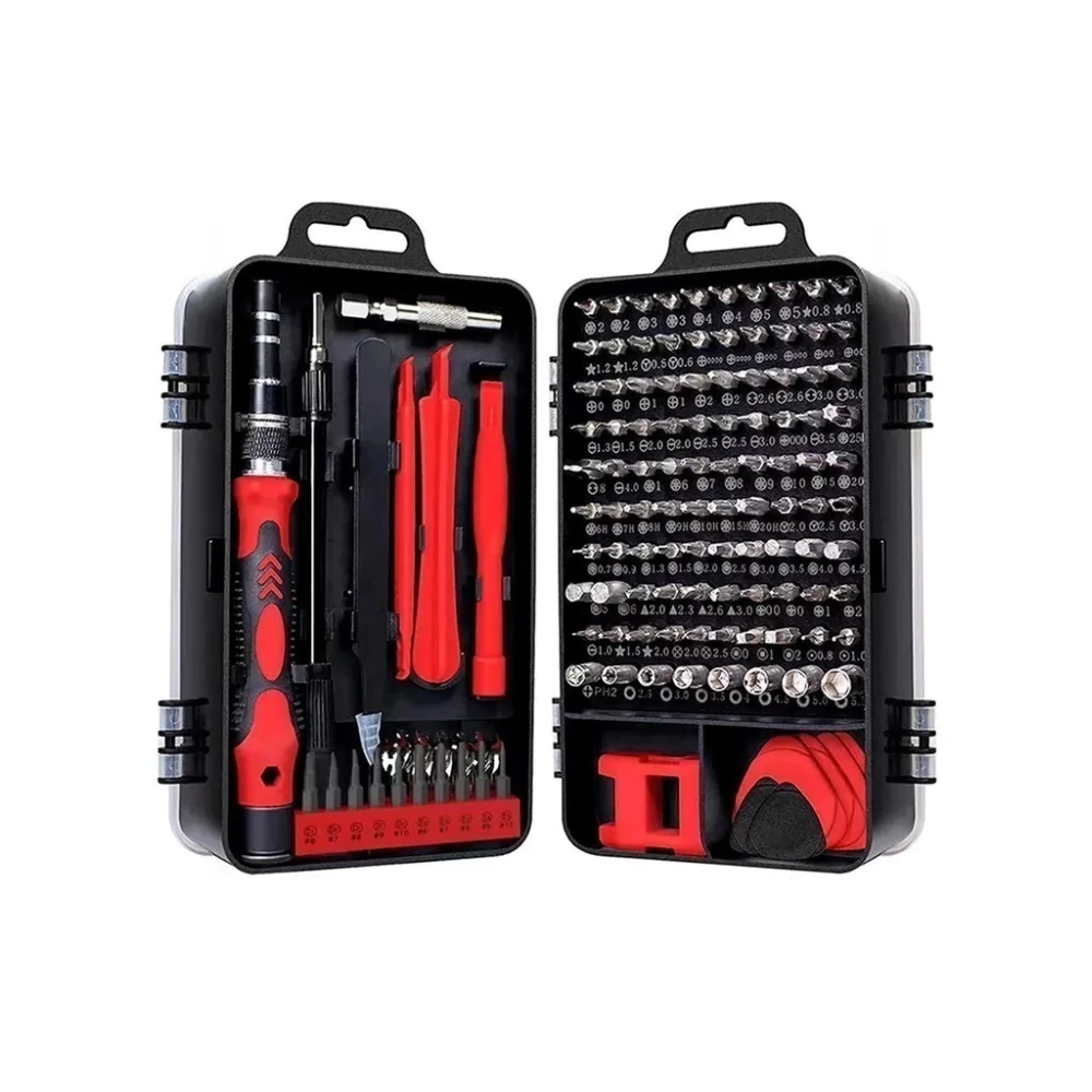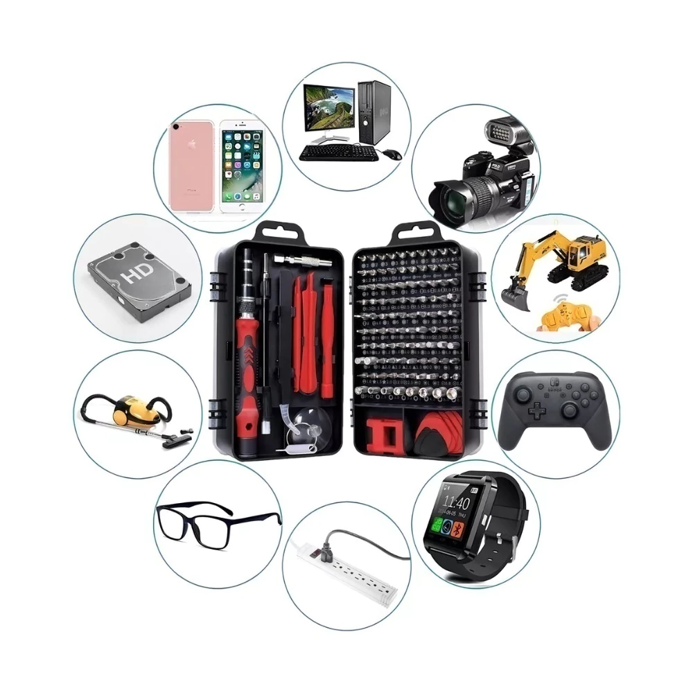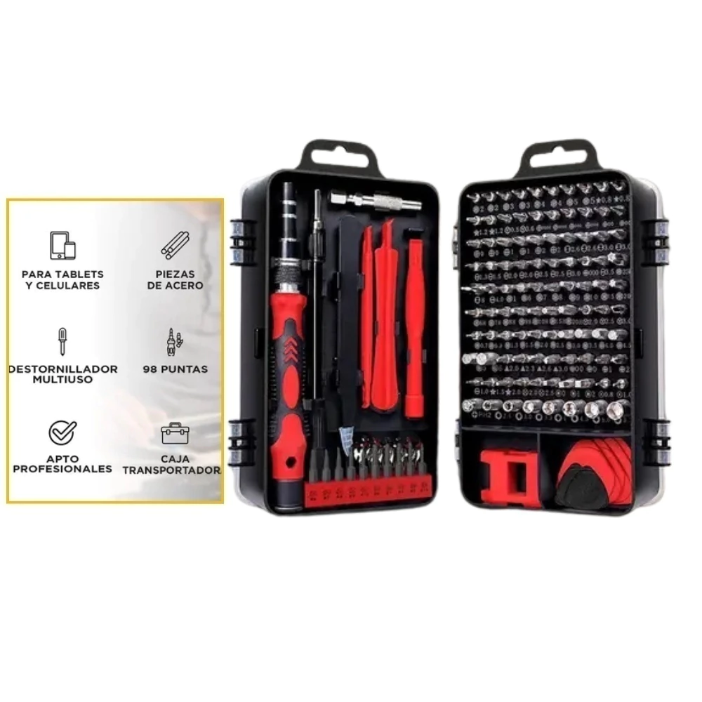 El Kit de Destornilladores 115 en 1 es la solución completa para todas tus reparaciones y trabajos de precisión. Ideal para celulares, relojes, notebooks, consolas, cámaras, electrodomésticos y más.