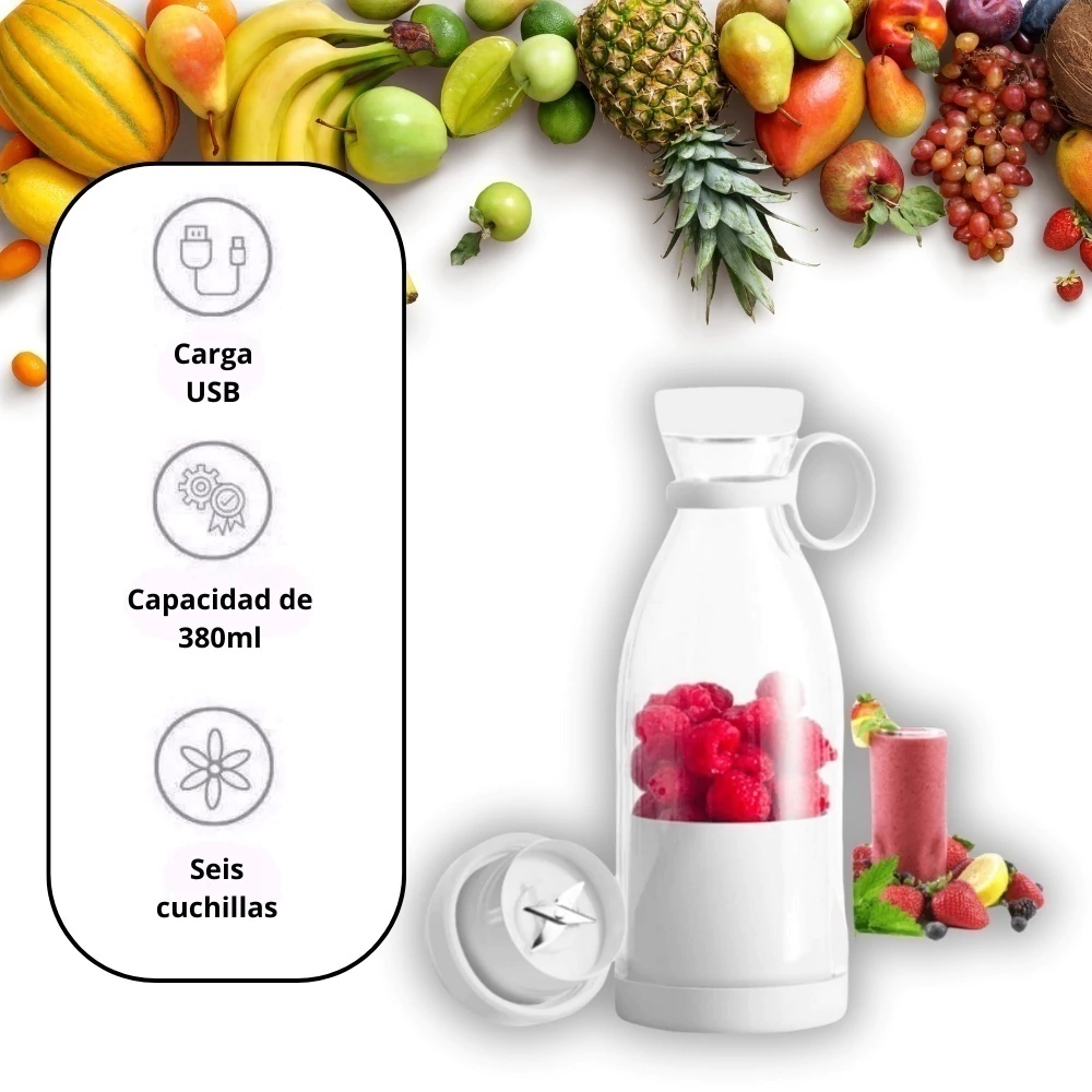 🥤 Prepará batidos, jugos y smoothies donde estés. Diseño tipo botella, USB recargable y vaso portátil para llevar al trabajo, gym o viajes. Lista en segundos y fácil de limpiar.