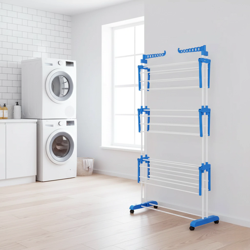 Secá más en menos espacio. El Tender vertical plegable BLACK JACK concentra 3 niveles de secado en formato torre para aprovechar pasillos, balcones o lavaderos chicos. Se pliega en segundos para guardarlo detrás de una puerta y sus ruedas facilitan moverlo incluso cargado. Las aletas laterales permiten colgar camisas y prendas delicadas en perchas para que no se deformen.